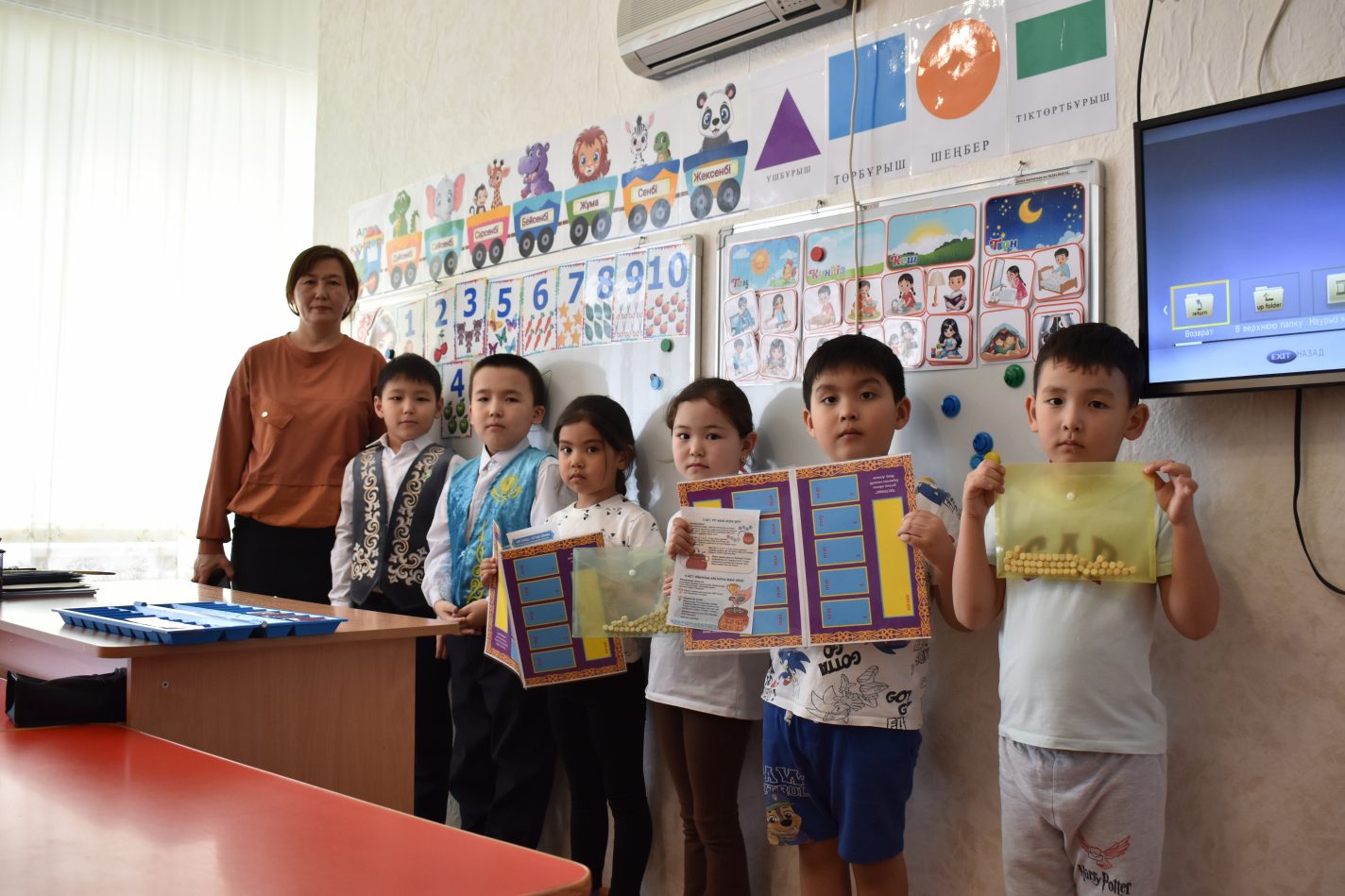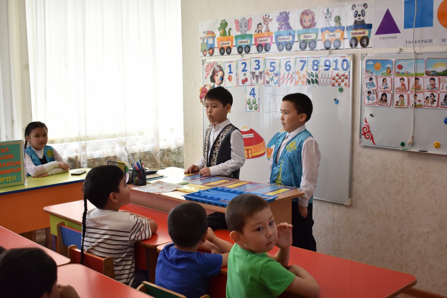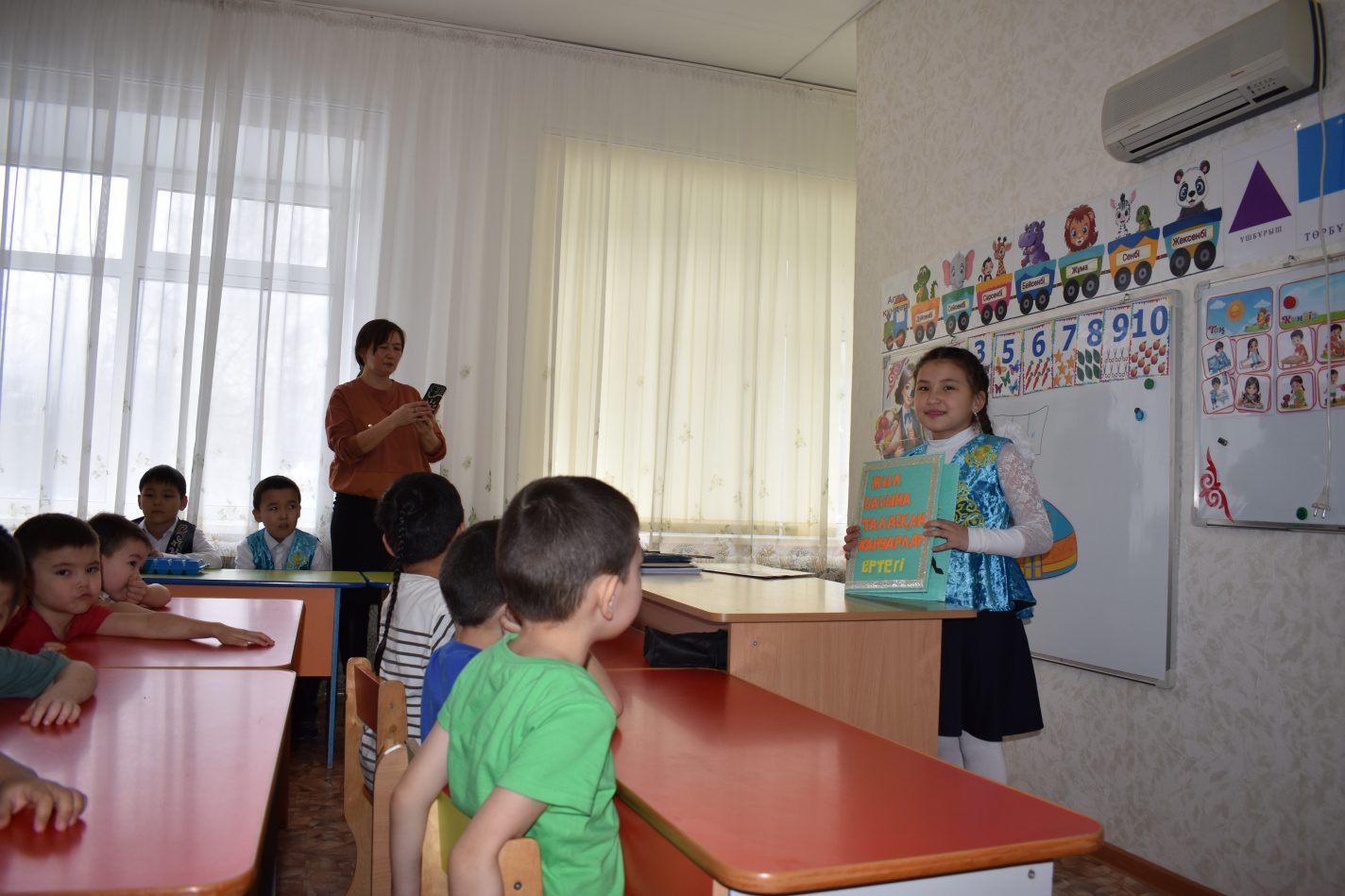 В рамках реализации плана работы по синхронизации детского сада и школы ученики 2 класса Окжетпесской средней школы представили творческий проект "Мир сказок", а также совместно с воспитанниками детского сада поиграли в национальные игры
